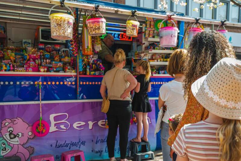 het grote kraam hebben wij 2 soorten suikerspin , verse popcorn , verpakt (kermis) snoep en ijsjes